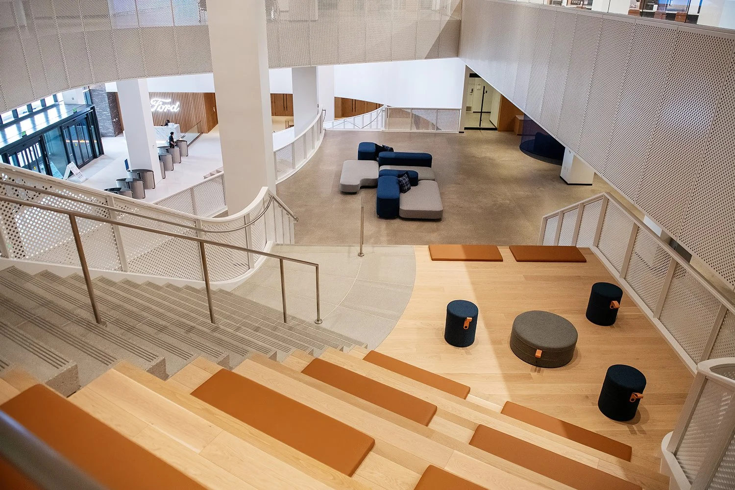 Much like the exterior, the interior of this building is a departure from the Ford offices of the past. The design offers many types of seating and spaces, from couches to types of tables and seating that you would liken more to a coffee shop than corporate headquarters. The idea is to promote collaboration and break down some of the silos of the past to benefit the company and enhance the worker experience. As someone who works from home I kept thinking about how much I would love to come here to edit and that is the point. Work from home has become the norm for Corporate American and employees are resistant to give that up. Building spaces like this however are how you combat that and bring workers back in house.