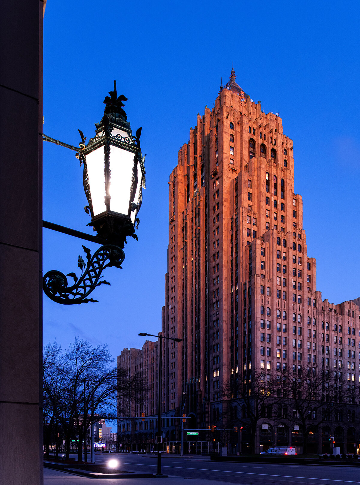 Architectural and fine art photograph taken in Detroit, Michigan. This image features a dramatic day to night edit of the Penobscot and Campus Martius in downtown Detroit.